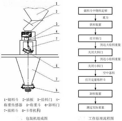 該顆粒包裝機(jī)由機(jī)架、給料器、稱料斗和電氣箱四部分組成。在對(duì)塑料顆粒、糧食、種子、炒貨、飼料等顆粒包裝工作開(kāi)始時(shí),本顆粒定量包裝機(jī)兩臺(tái)給料器同時(shí)對(duì)稱料斗喂料,喂料過(guò)程由控制儀表通過(guò)對(duì)傳感器輸出信號(hào)連續(xù)采樣,并隨時(shí)與大投值比較,當(dāng)料重不小于大投值時(shí),自動(dòng)停止大投給料器,剩下一臺(tái)小投給料器繼續(xù)細(xì)喂料,并與目標(biāo)值比較,當(dāng)料重接近目標(biāo)值時(shí)(稱重值=目標(biāo)值-落差值),停止喂料,等待操作者套袋,有套袋操作時(shí),感應(yīng)開(kāi)關(guān)向儀表送出開(kāi)關(guān)信號(hào),塑料顆粒包裝機(jī)卸料,無(wú)套袋操作時(shí)機(jī)器等待,直至套袋卸料。